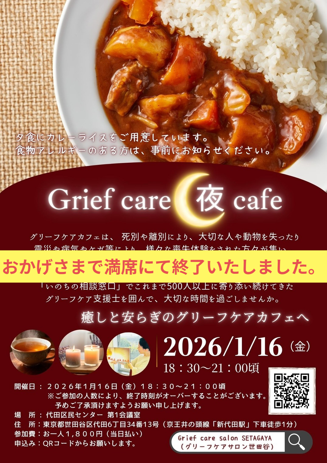 昔、駆け込み寺という言葉が流行り、実際に存在しました。このグリーフケアカフェも駆け込もうとしたら、その場所の扉を開けて待っていて下さるご夫婦がいらっしゃいました。どれだけ安心できたか、どれだけ救われたことかと思っています。その上、お腹がすいたでしょうと、豪華なカレーライスを用意して下さっていて、駆け込み寺なら、おにぎりだったかもしれません。いろんな思いが込められた、カレーライスとても美味しかったです。本当にありがとうございました。