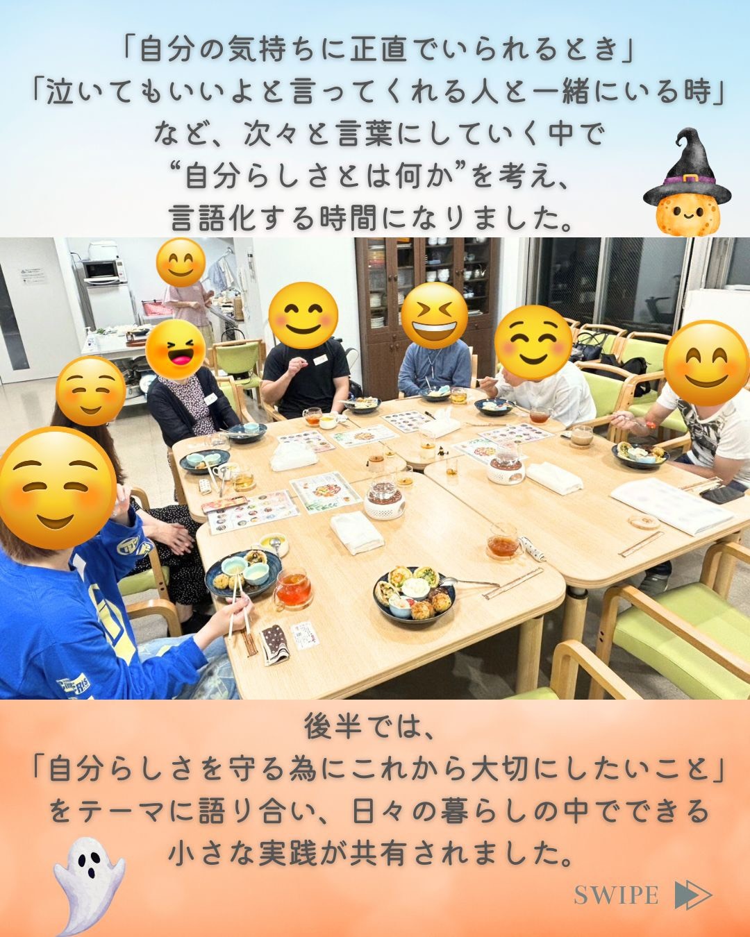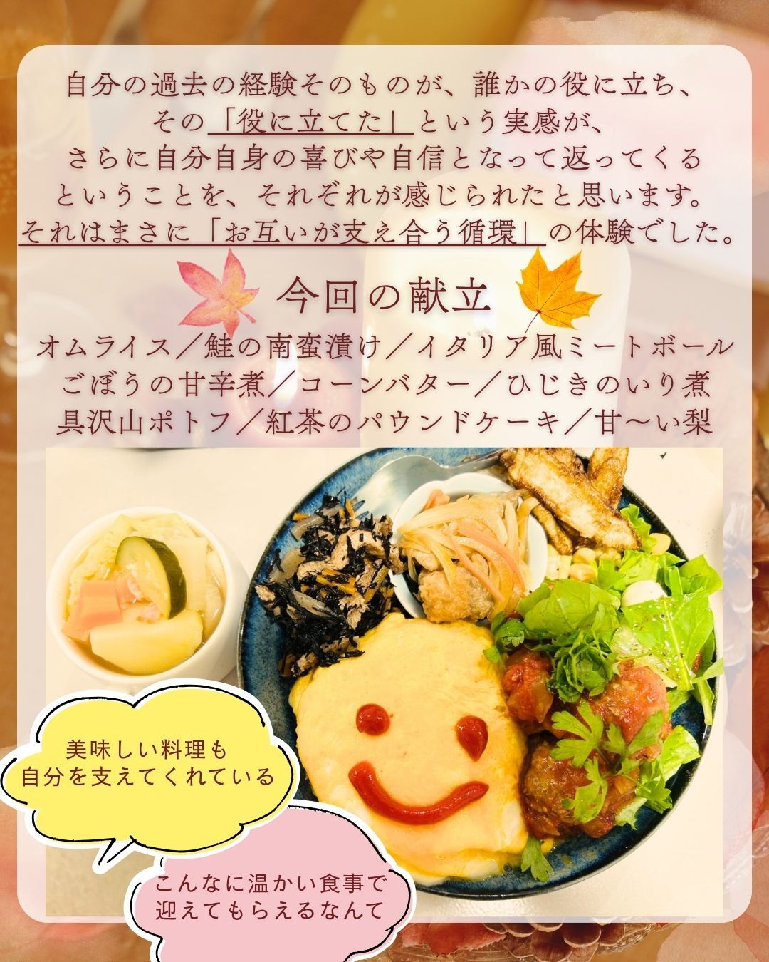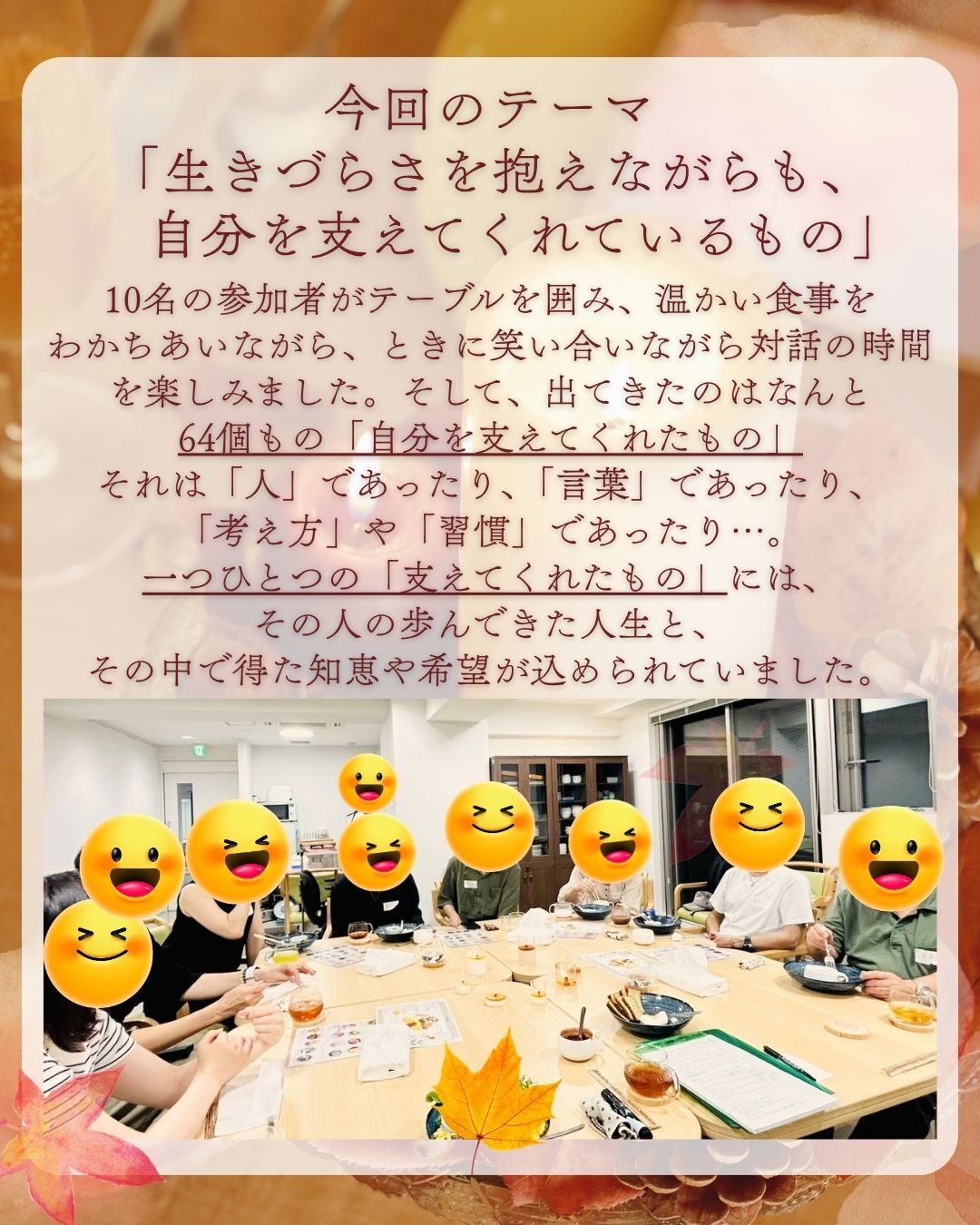 同じ気持ちを抱える同士が集り、安心・安全なルールの下で自分の気持ちや考えをアウトプットする時間は、とても貴重な時間だと思いました。スタッフさんの愛情たっぷりのお料理に、参加者の固く閉ざされた心も緩み、とても穏やかで優しく、尊い時間が流れていたように思います。『生きづらさ』と聞くと、一見ネガティブにも聞こえますが、それは、前向きに生きようとする気持ちの現れであり、自分を知るための大きな一歩なのだと思いました。