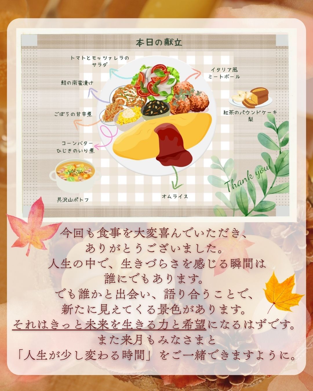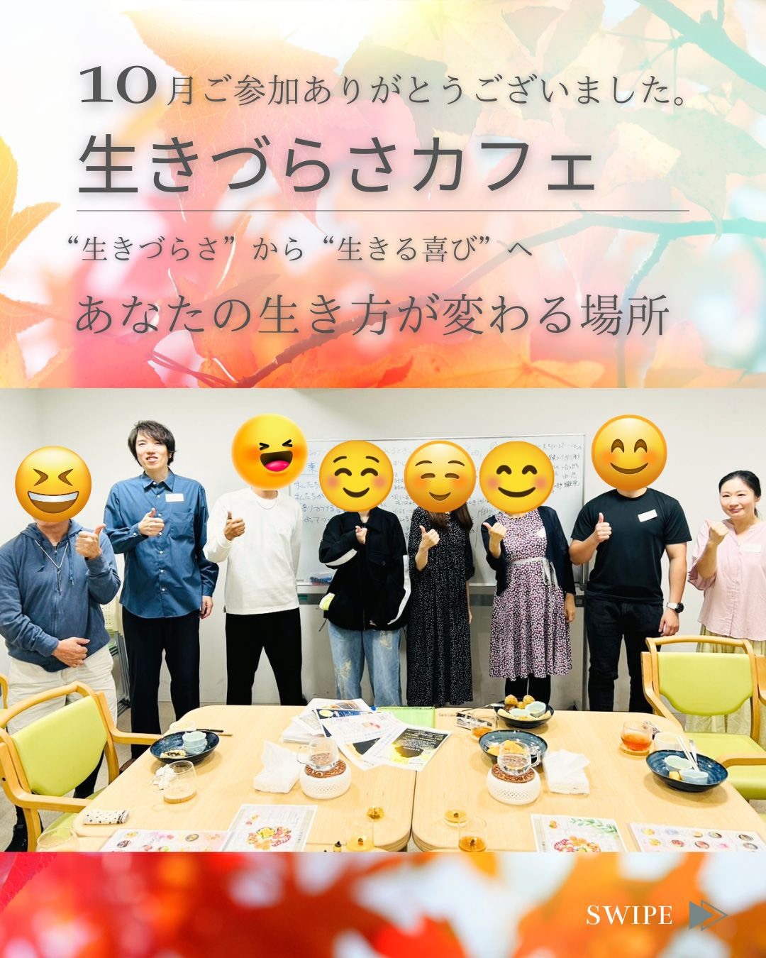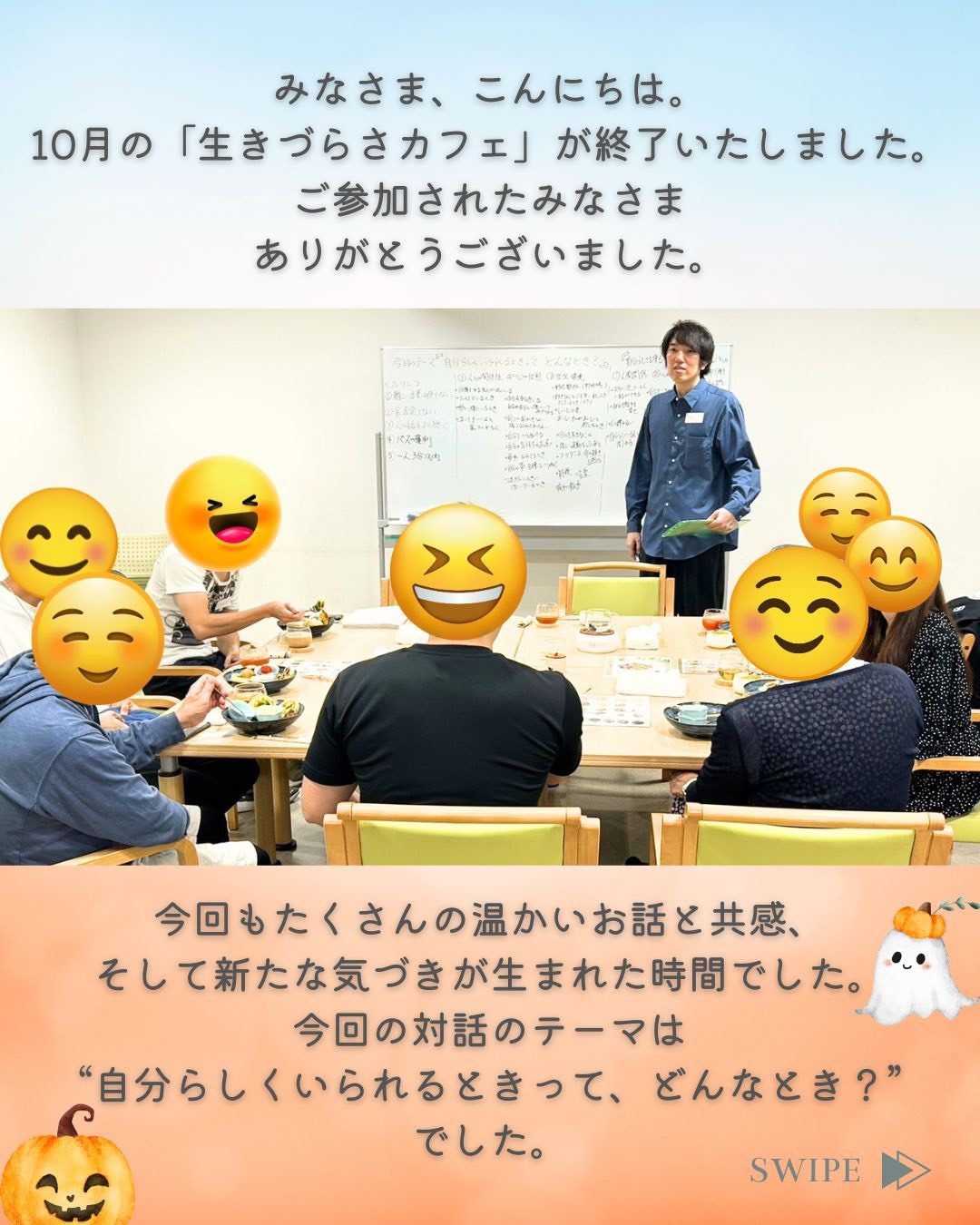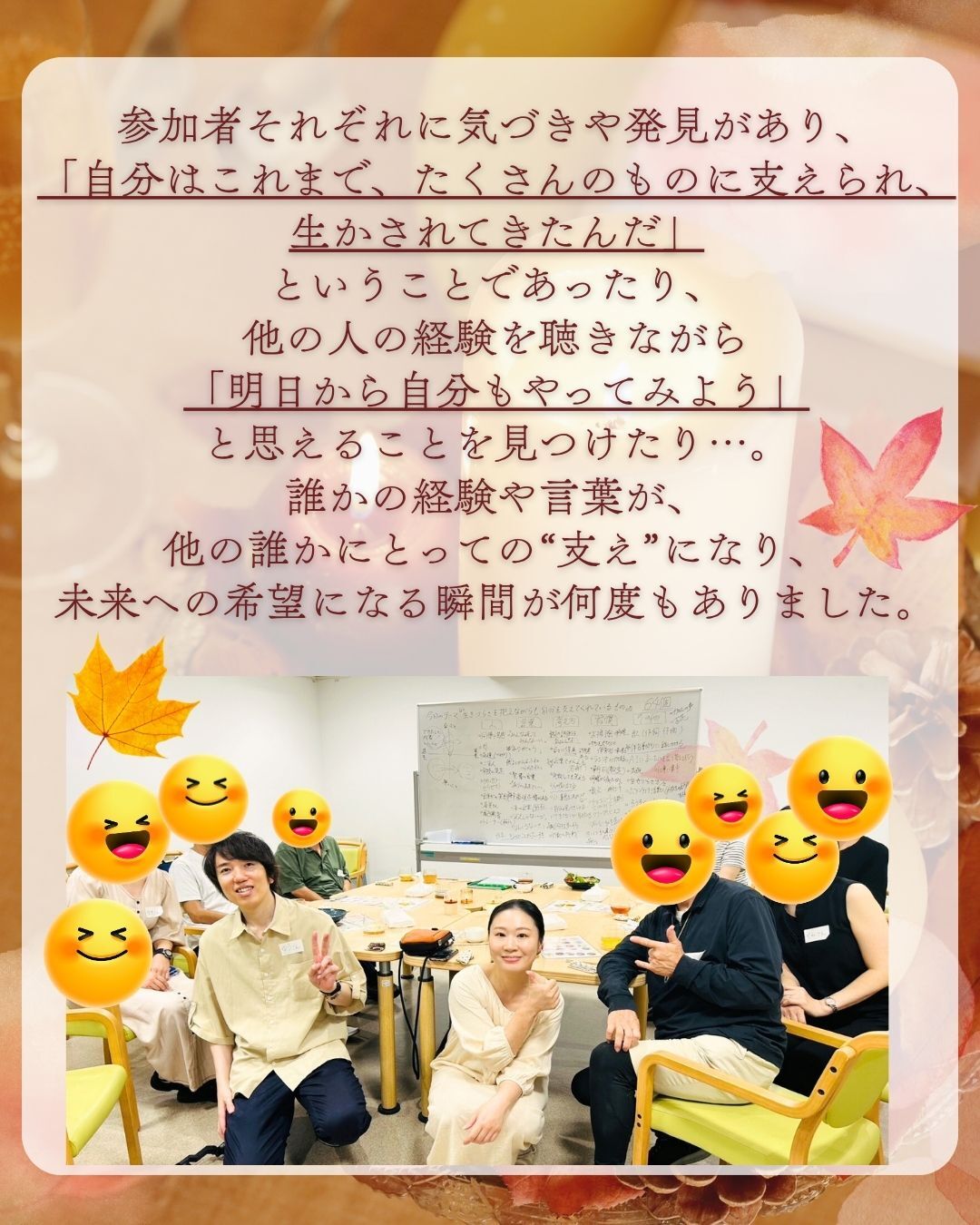 同じ気持ちを抱える同士が集り、安心・安全なルールの下で自分の気持ちや考えをアウトプットする時間は、とても貴重な時間だと思いました。スタッフさんの愛情たっぷりのお料理に、参加者の固く閉ざされた心も緩み、とても穏やかで優しく、尊い時間が流れていたように思います。『生きづらさ』と聞くと、一見ネガティブにも聞こえますが、それは、前向きに生きようとする気持ちの現れであり、自分を知るための大きな一歩なのだと思いました。
