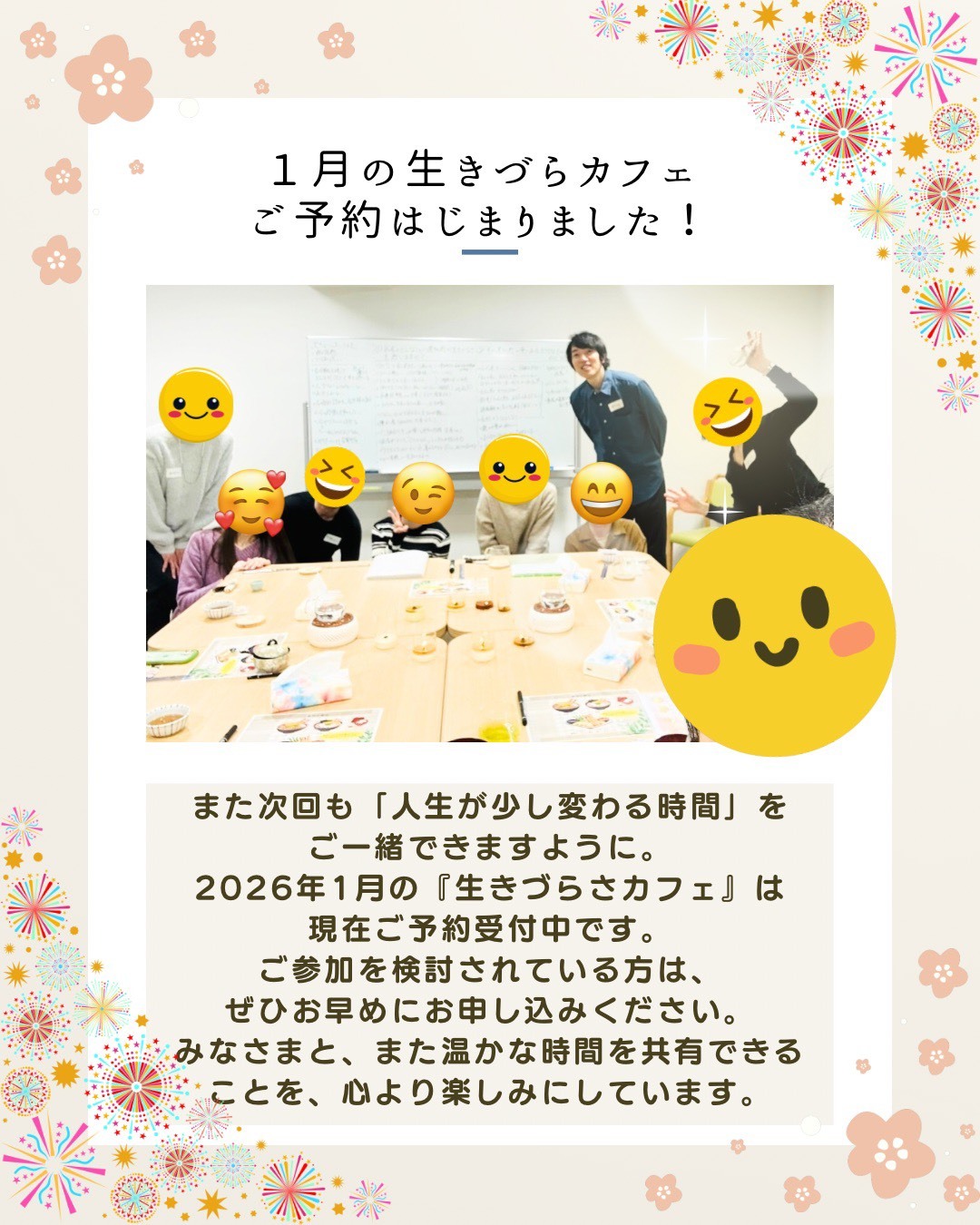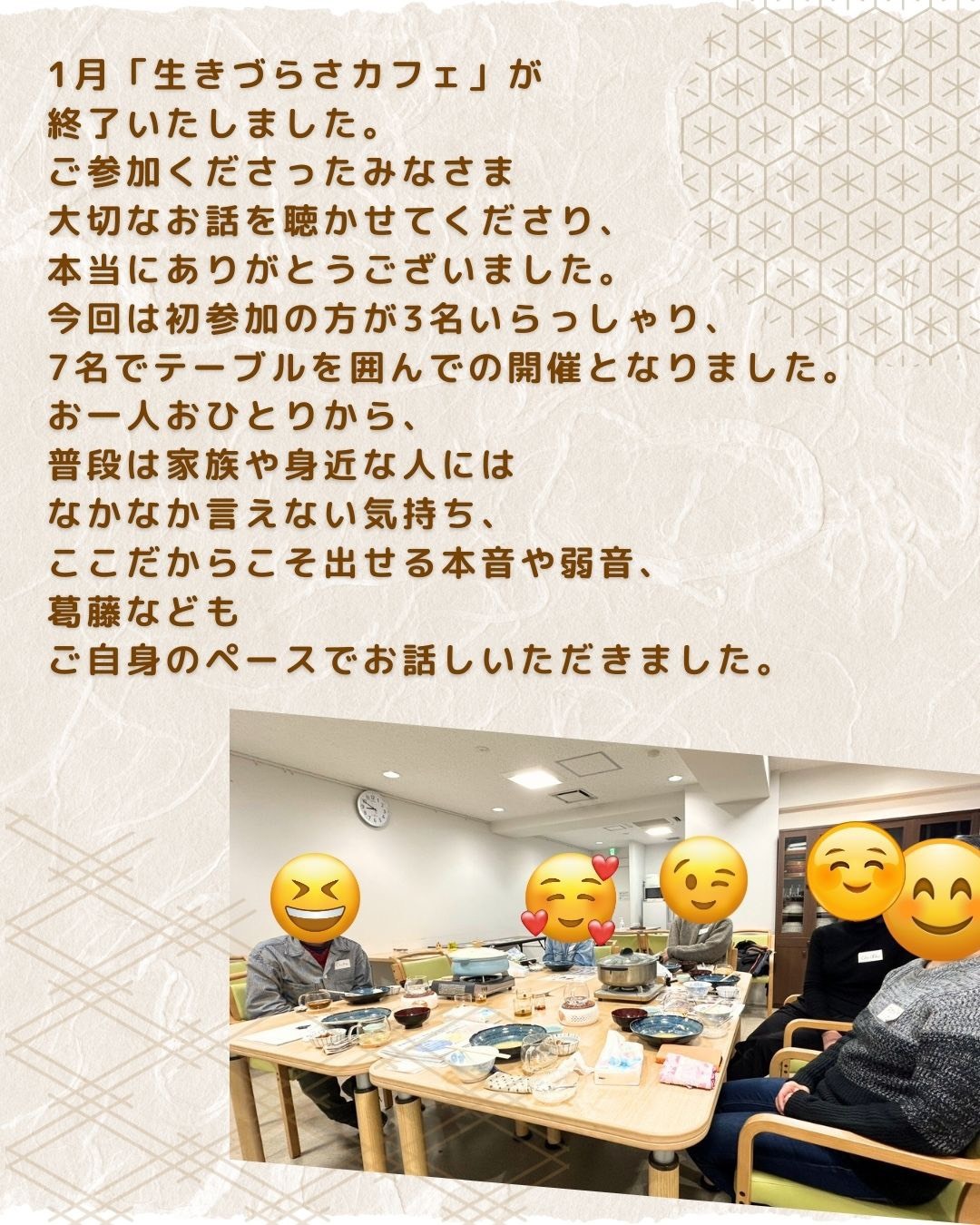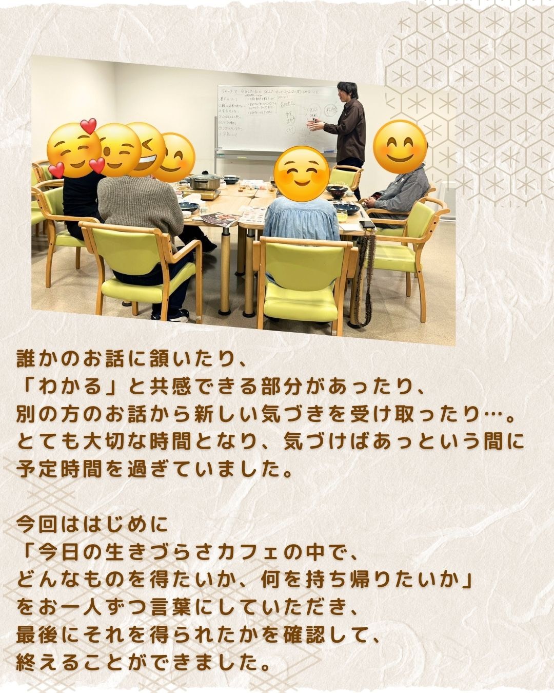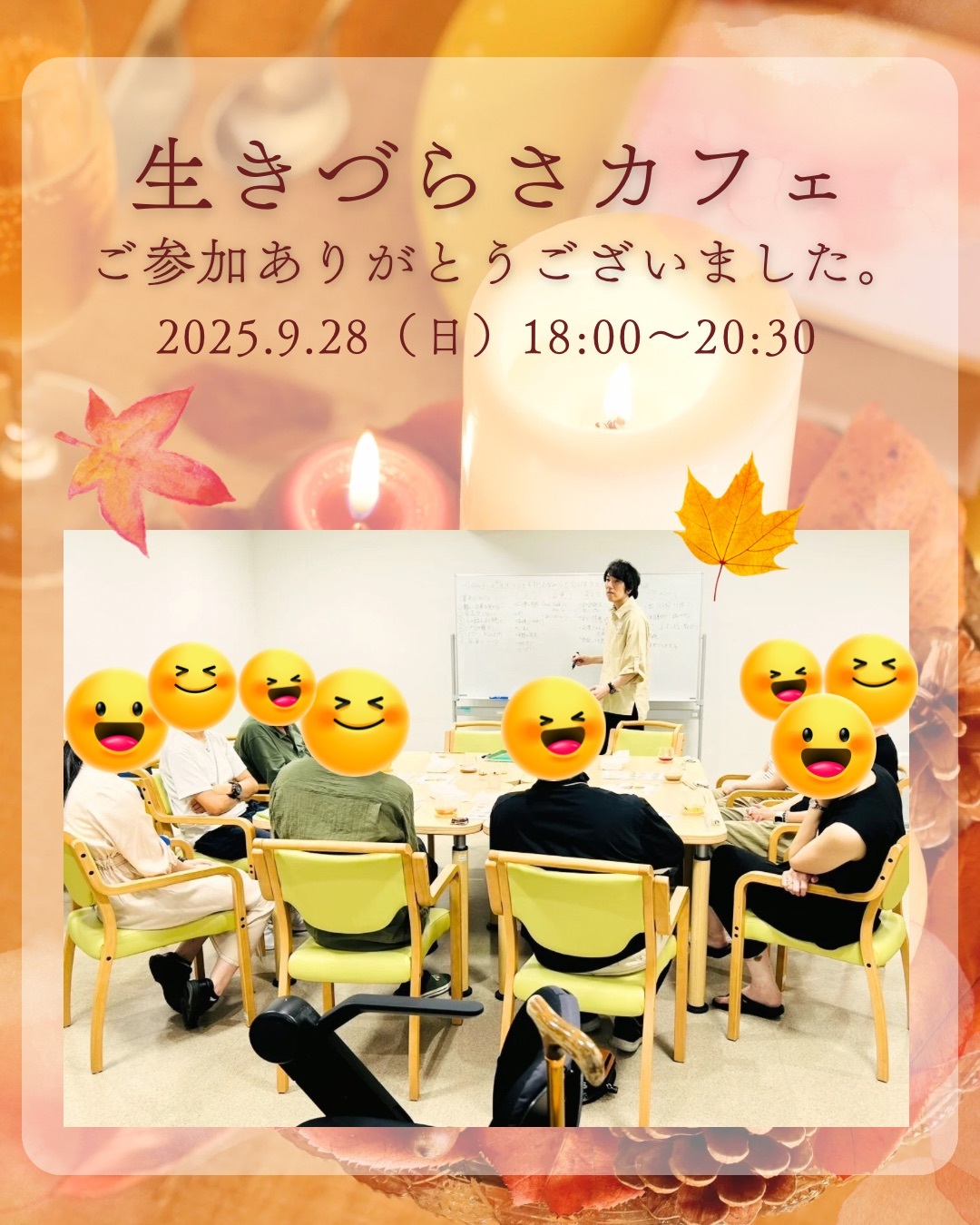 和やかな雰囲気で、みなさんの声と表情に癒された。このカフェに参加し続けるのは、自分にとっての救いの一つになると思う。