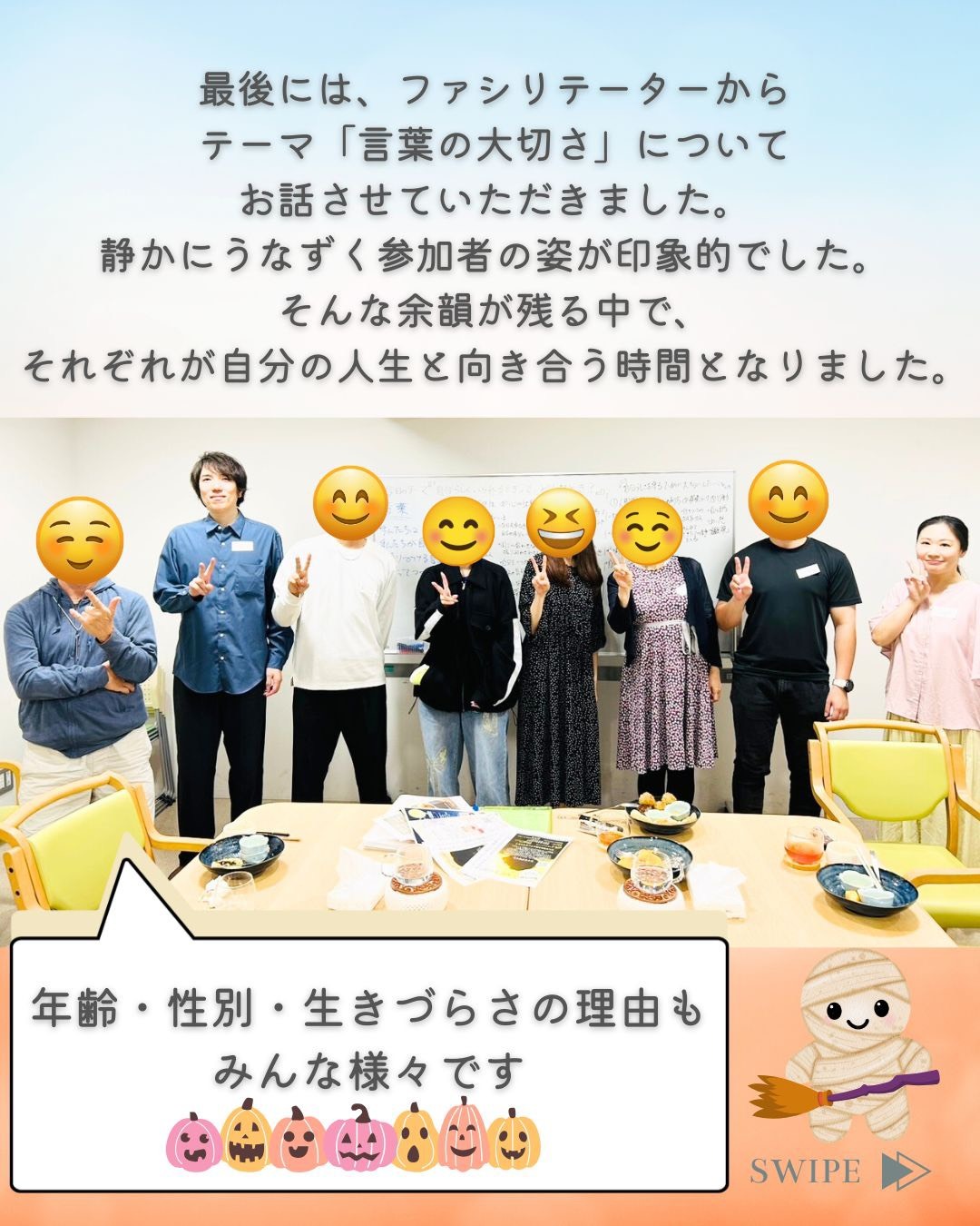 『生きづらさ』を感じつつも、前向きに生きようとする、年齢も性別も異なる方々の『生き方』を聞いて、仲間が出来たような心強い気持ちになりました。自分の話せる範囲内で話せば良かったので、気が楽でした。