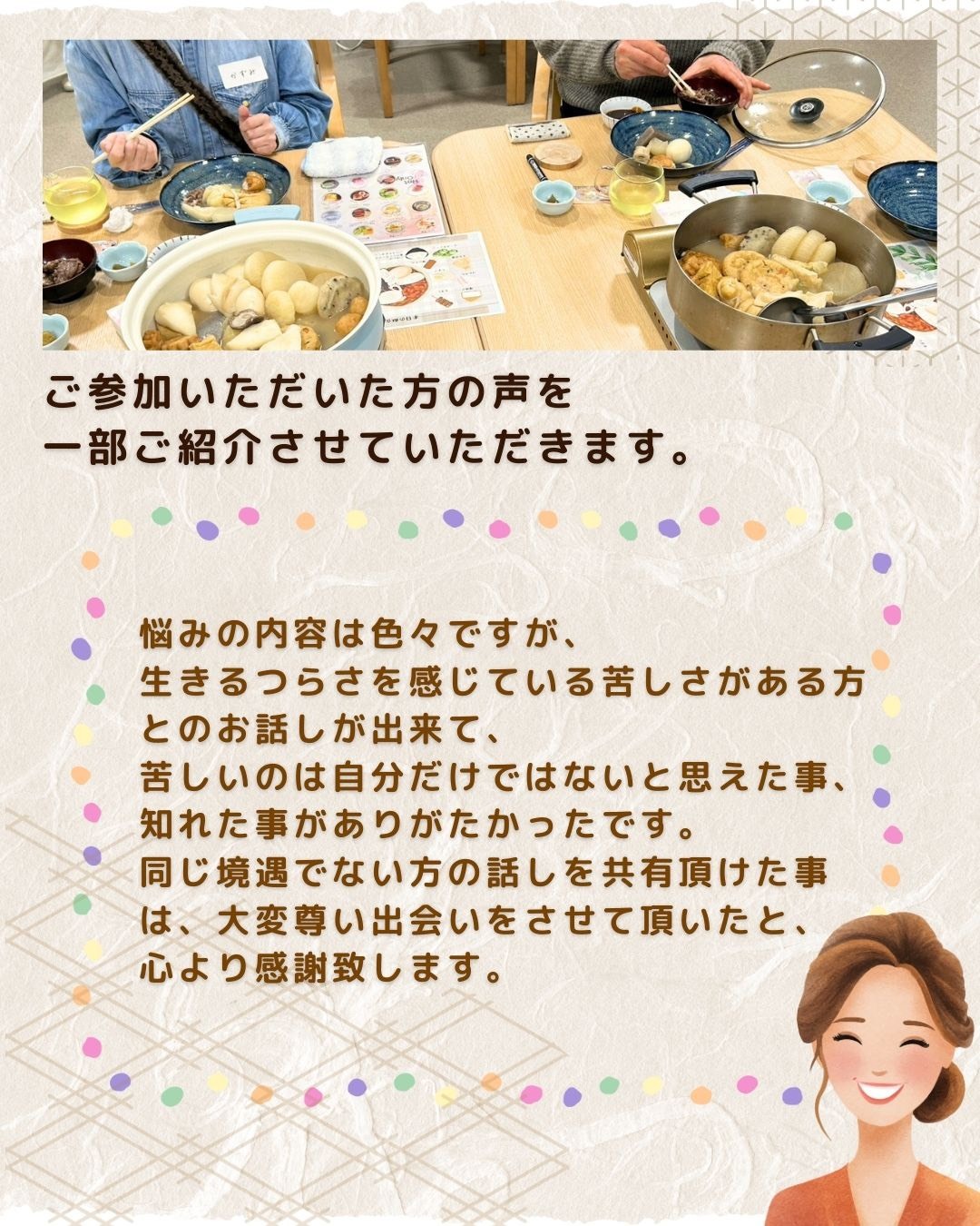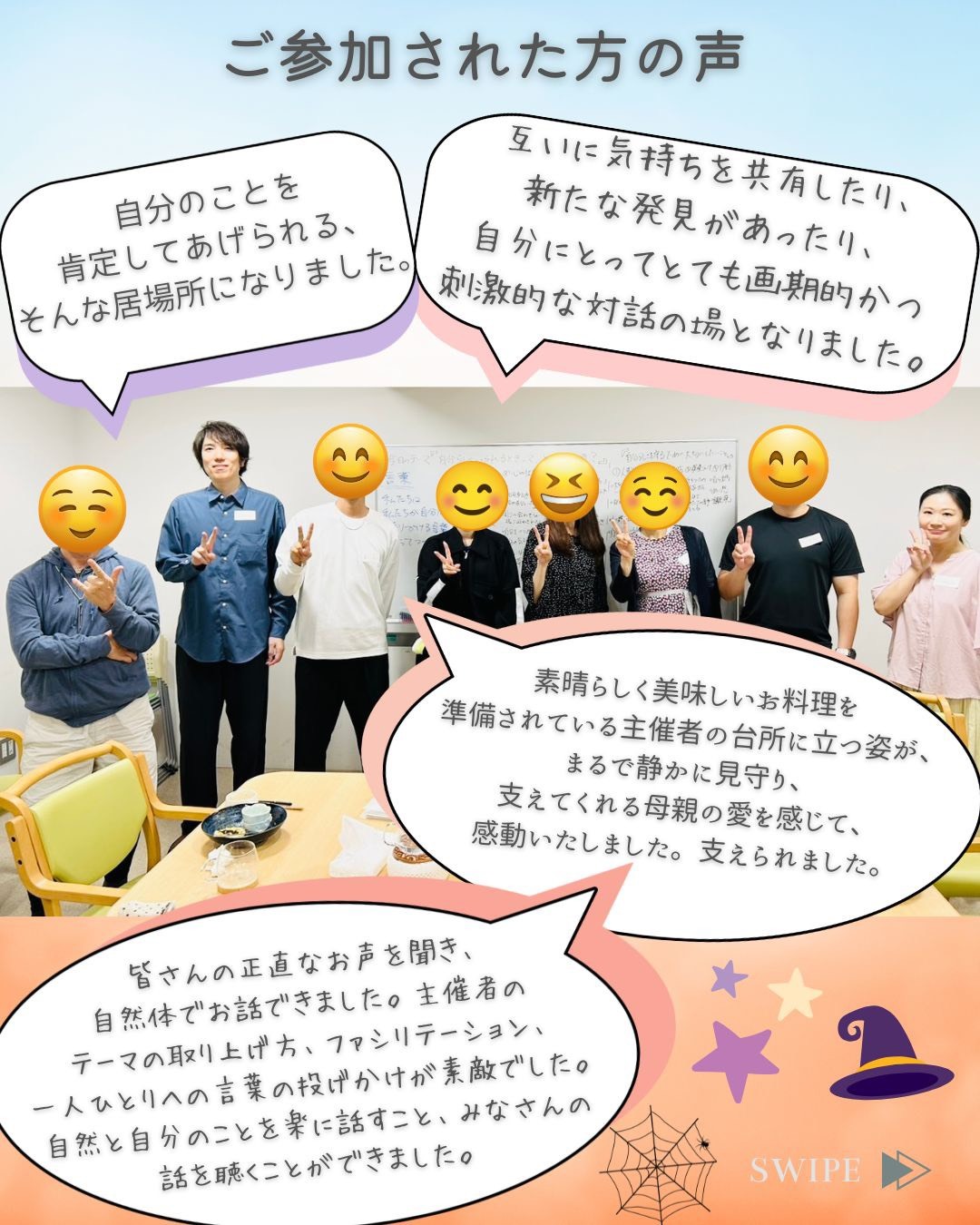 自分の話せる範囲で話せばよかったので、気が楽でした。初めての参加で、伺う前はすごく不安だったのですが、扉を開けた瞬間に安心できる空気を感じました。集まった人のきっかけはそれぞれ違えど、始まればどなたの話にもお互いに共感できる場面があり、モヤモヤが少し晴れて楽になりました。何よりご飯が美味しかったです。