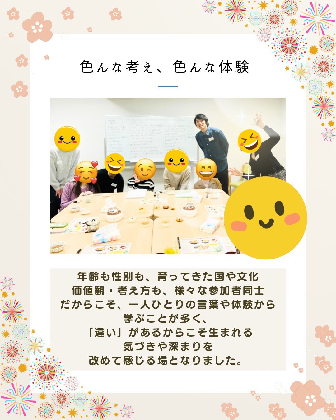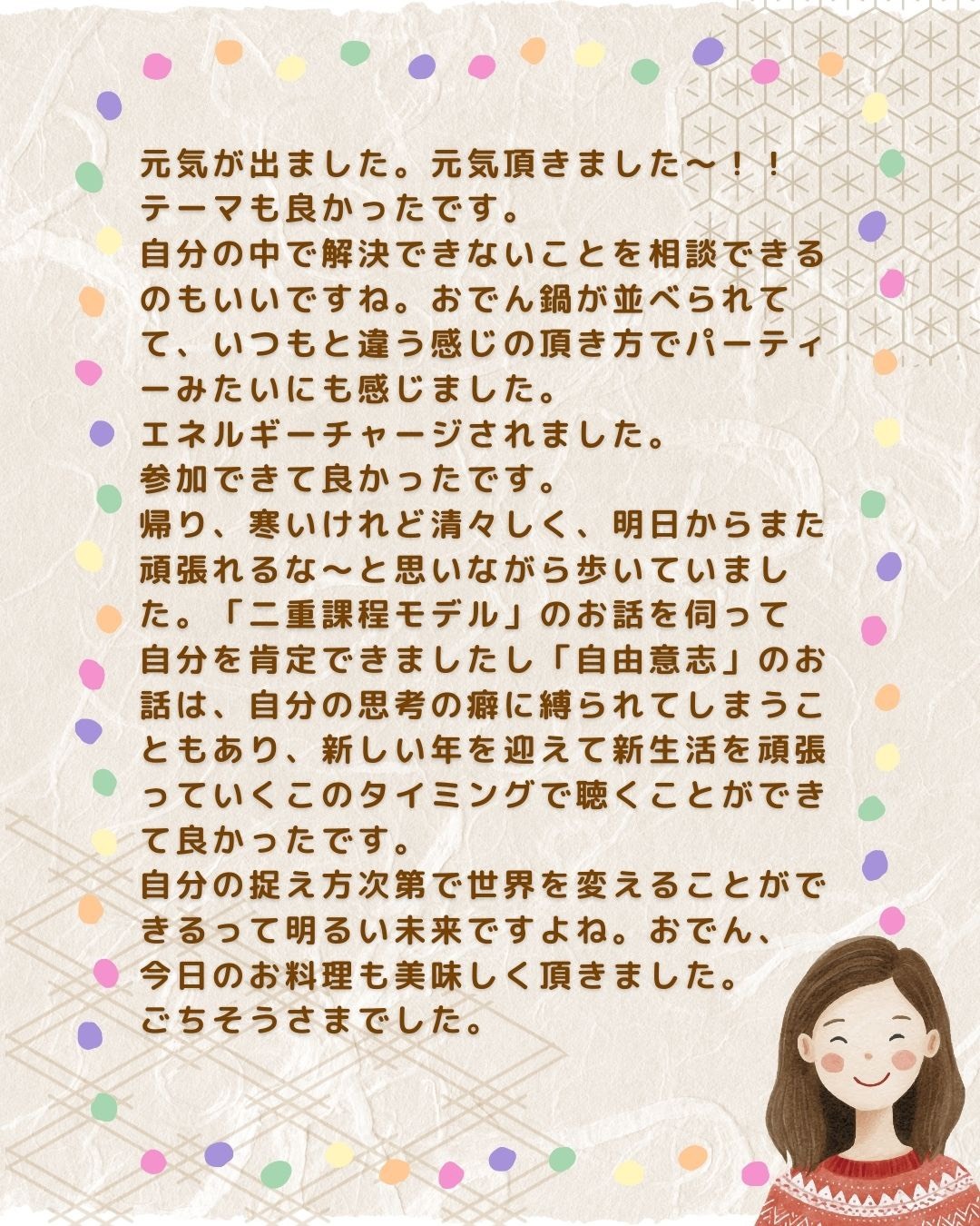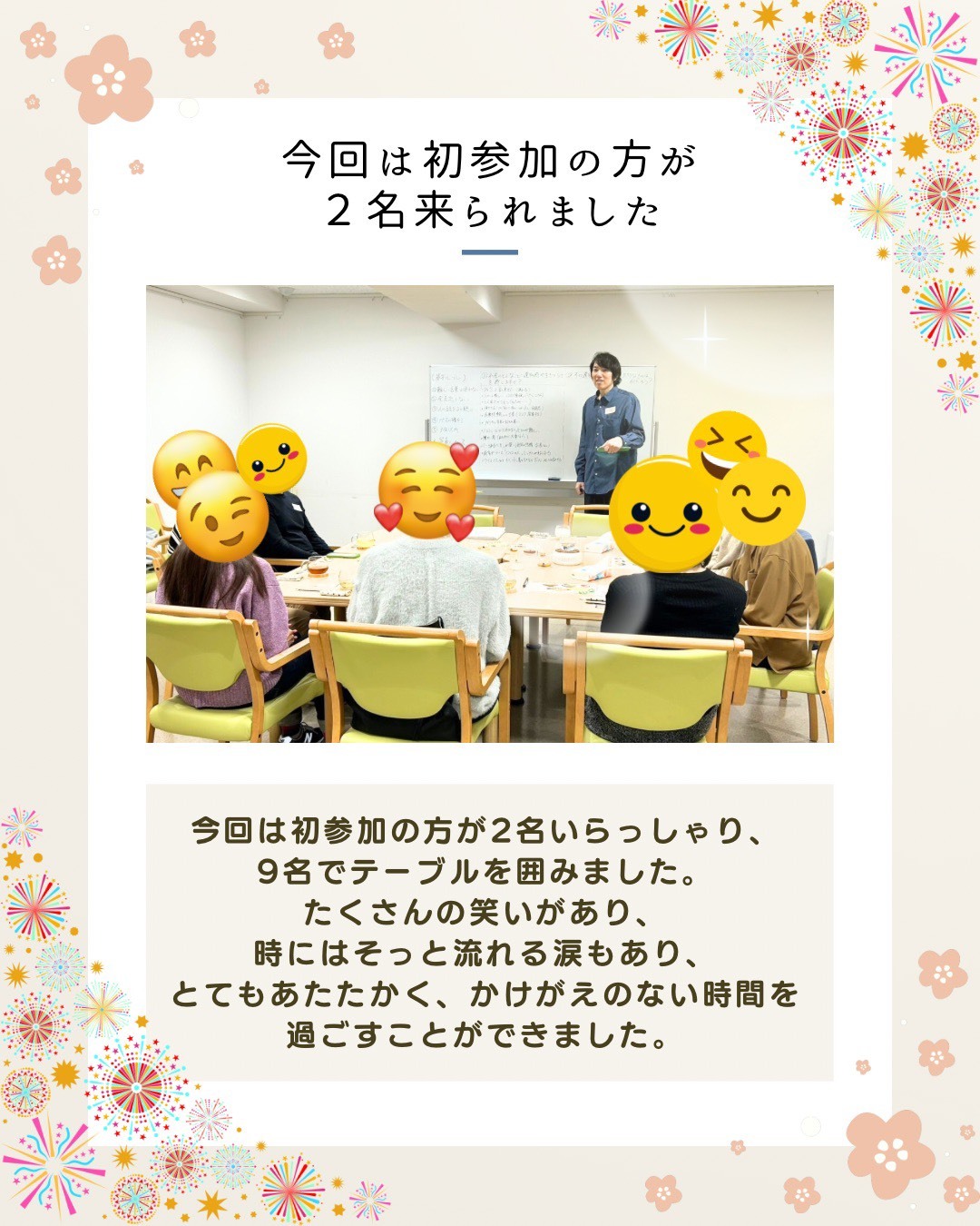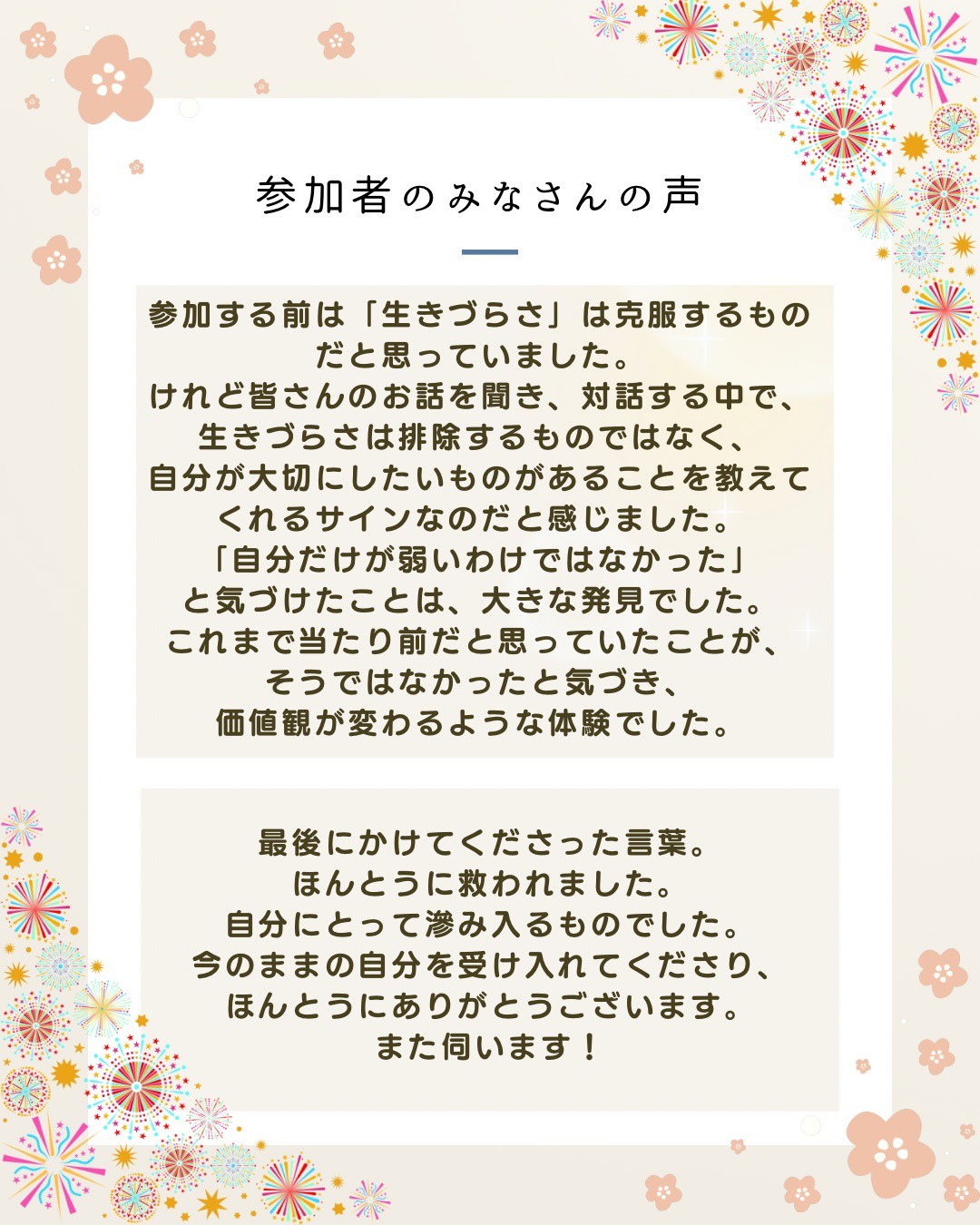 安心して和やかな雰囲気だった。参加者一人ひとりが安心できるような空気作りをしてくれて、みんなが居心地の良い空間を作ってくれたおかげで、私自身を安心して参加できた!