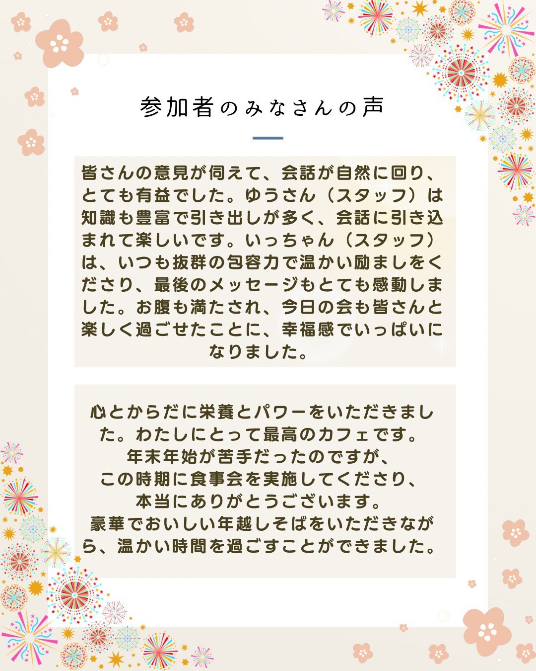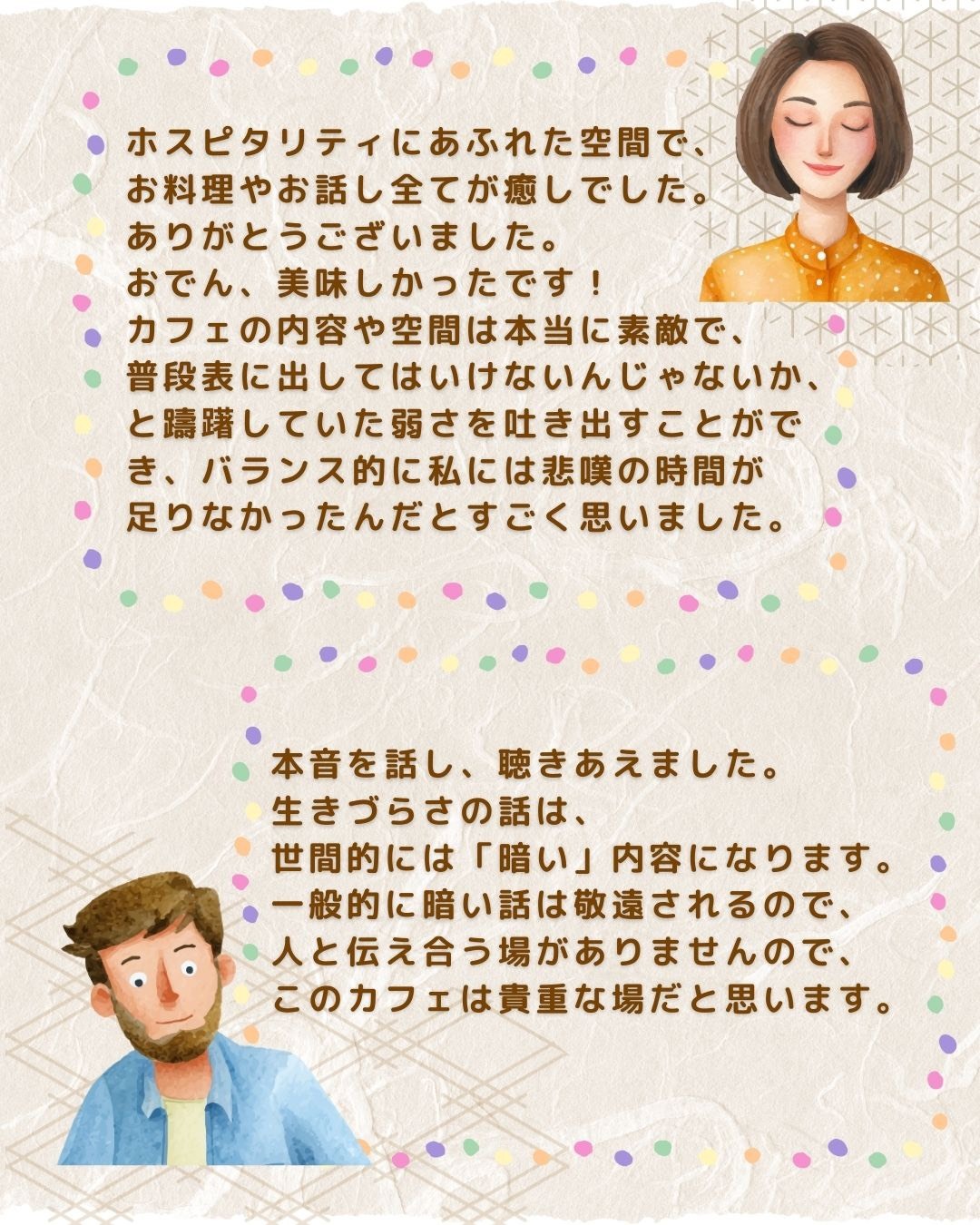 自分にとって心地良い大切な「居場所」が出来たと感じました。テーマもとても魅力的でした。ただ食事をして楽しむだけではなくて、生きづらさを解消するために色んなことを考えてくださっていると感じました。スタッフさんお2人のこれまでの歩み、生きづらさを克服されたお話は、とても心に響きました。自分にはない価値観でお話してくださり、気づきが沢山ありました。このような場を提供してくださり、感謝しかありません。