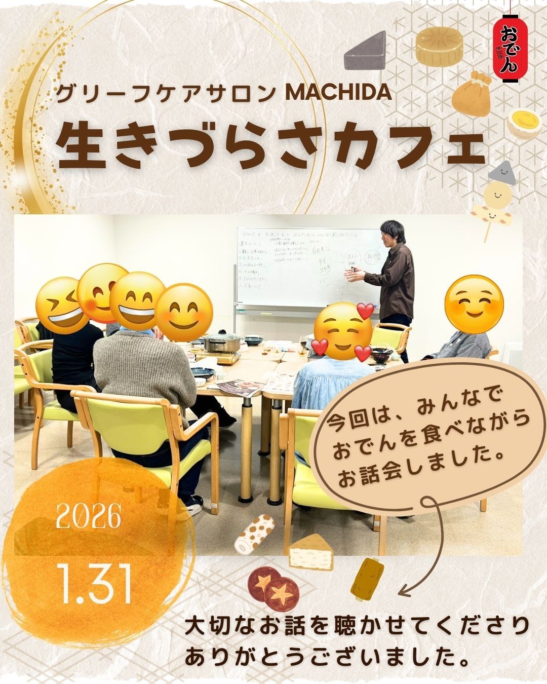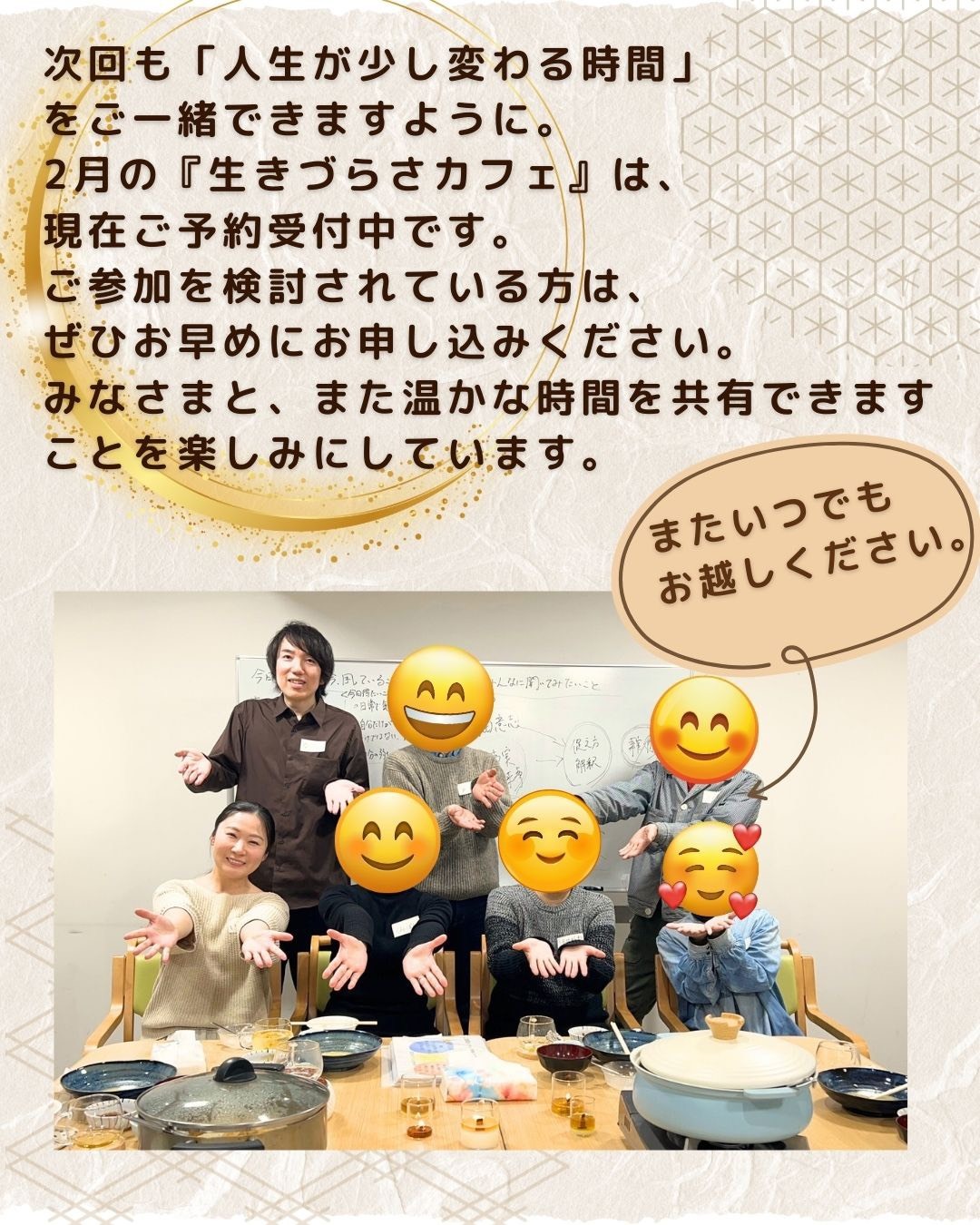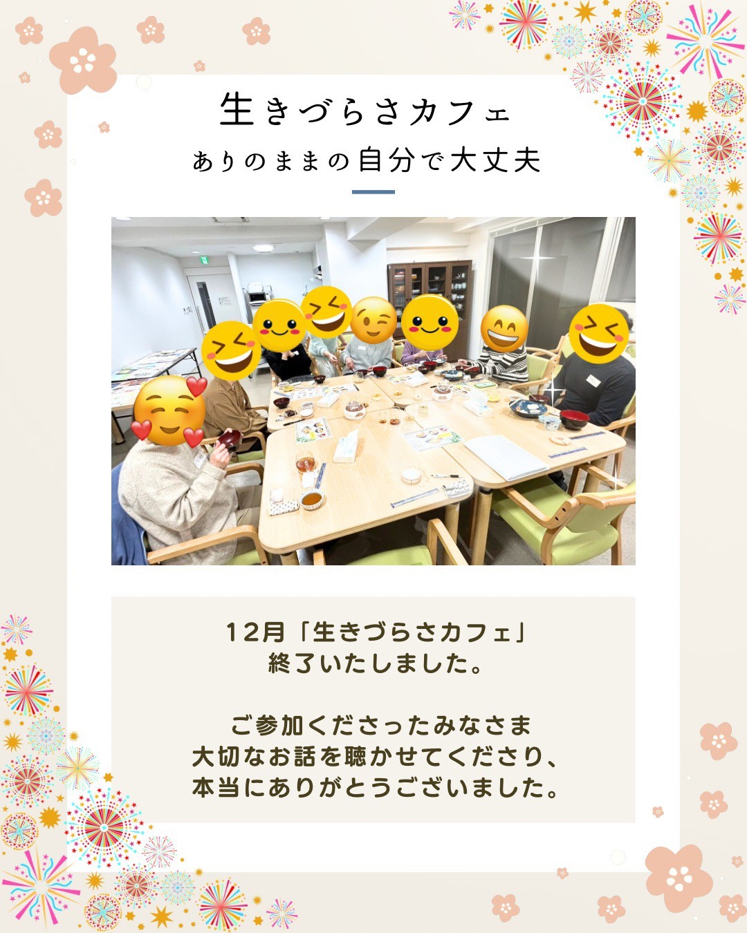 温かい時間を過ごせました。普段は人と話すのが怖いと感じることがあり、心が傷つきやすく、誰かの目をいつも気にしてばかりいるので、参加するのは、内心とても緊張しましたが、スタッフさんが優しくて、自分を丸ごと受け入れてくれるような温かい空間で、安心していられました。お腹がいっぱいになるほどご飯を食べさせてくれて、「みんなで話すこと」「一緒にご飯を食べること」「笑い合うこと」は、自分の中からオキシトシンという、幸せホルモンが出てくることを教えてくれました。こんな何気ない時間が、今、自分には必要なことなんだと知りました。これからは自分のために生きづらさカフェに積極的に参加してみようと思います。